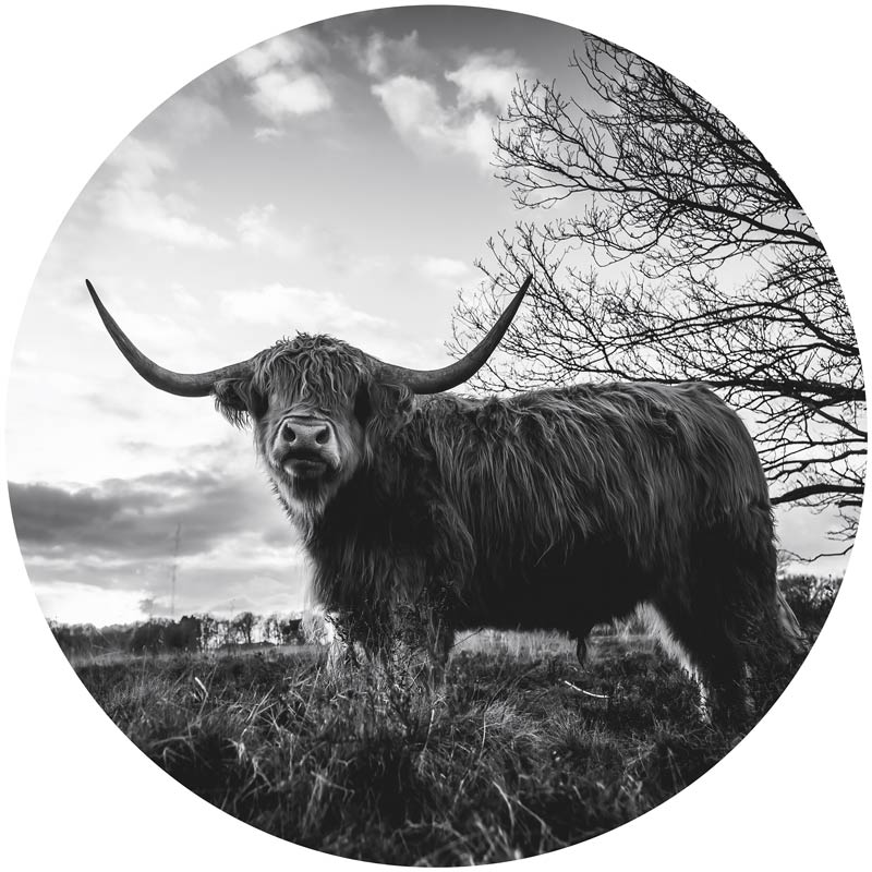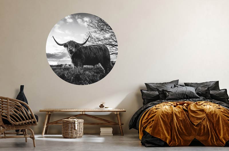 Die runde Tapete mit dem schottischen Hochlandrind ist ein echter Blickfang und die perfekte Ergänzung für jeden Raum.