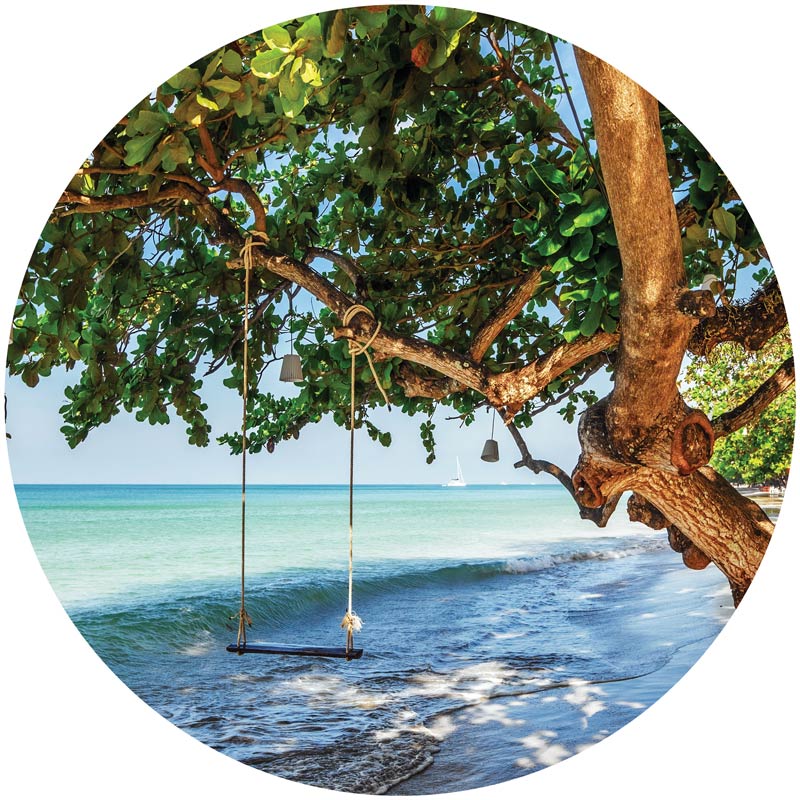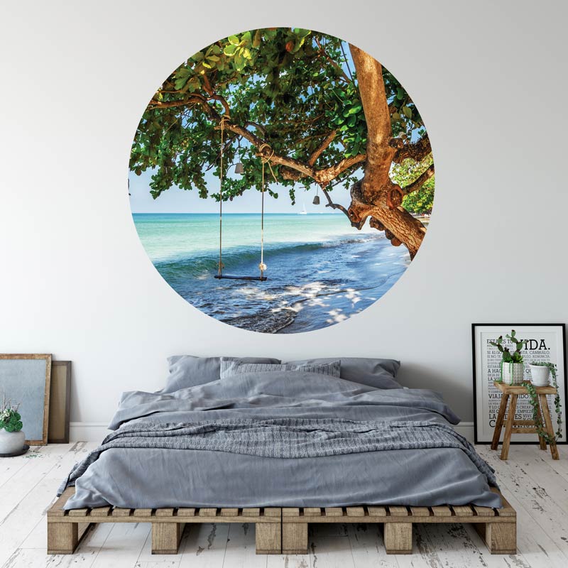 Runde Tapete mit einer Baumschaukel über dem Meer an einem paradiesischen Strand.