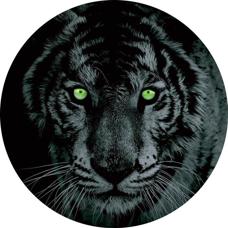 Runde Tapete mit einem beeindruckenden Tiger mit wunderschönen grünen Augen.