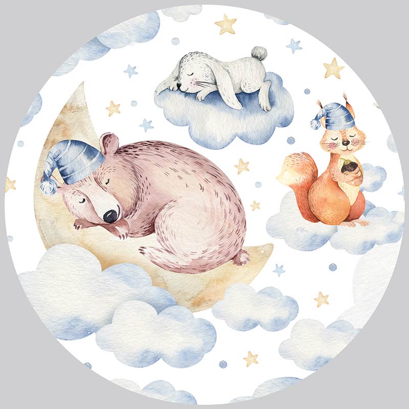 Runde Tapete mit einem schlafenden Bären, Eichhörnchen und Hasen. Sie sorgen dafür, dass Ihr Kind wie ein Engel schläft.