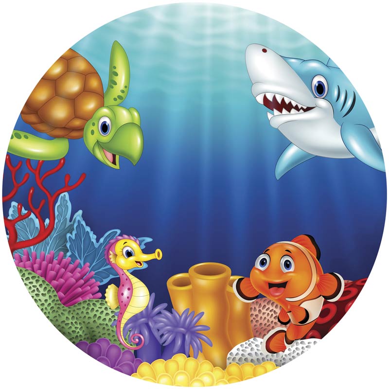 Ein wunderschöner Tapetenkreis fürs Kinderzimmer mit einem fröhlichen Hai, einer Schildkröte, einem Seepferdchen und vielen bunten Fischen.