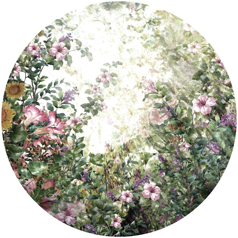 Runde Tapete mit einer üppig bewachsenen Landschaft voller Blumen und Pflanzen.