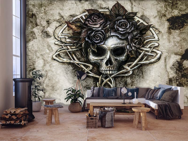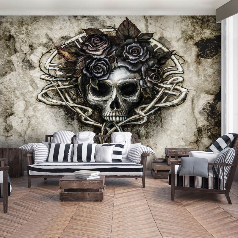 Die Totenkopf-Fototapete ist ein echter Blickfang im: Wohnzimmer, Schlafzimmer, Hobbyraum, Mancave, Küche, Flur, Büro oder jedem anderen Raum.
