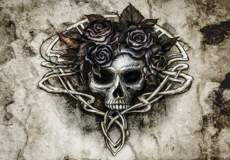 Fototapete von einem Totenkopf mit schwarzen Rosen.
