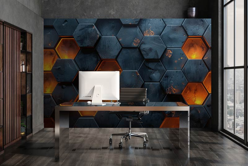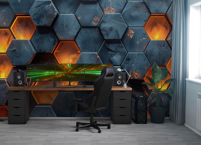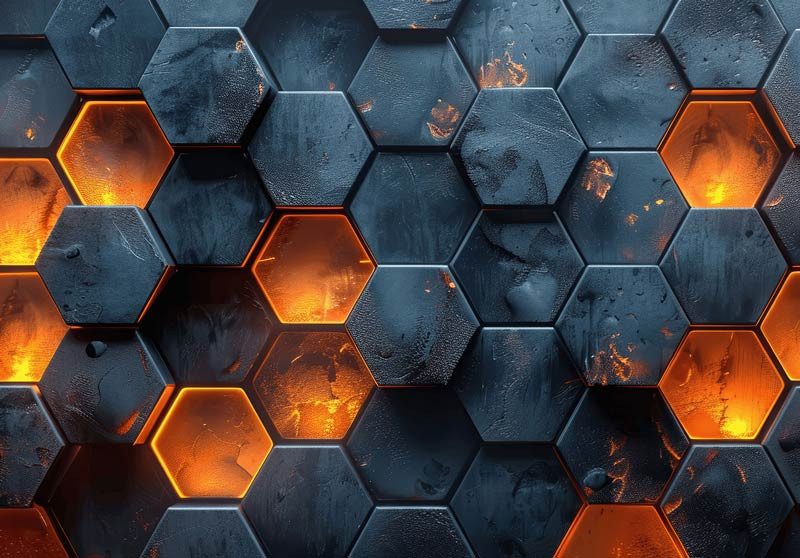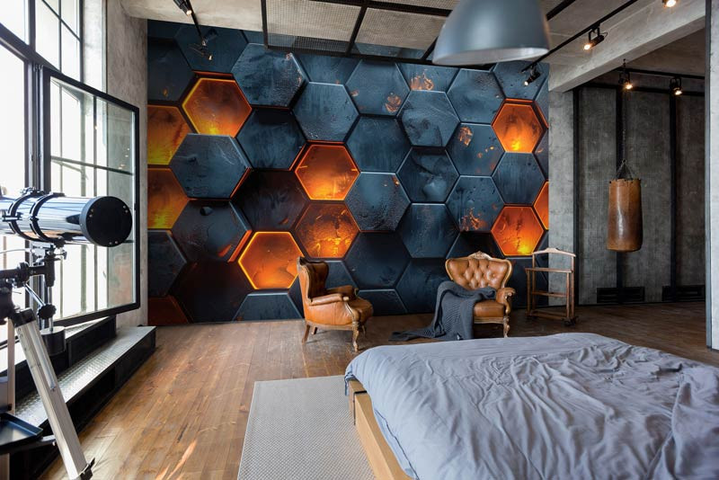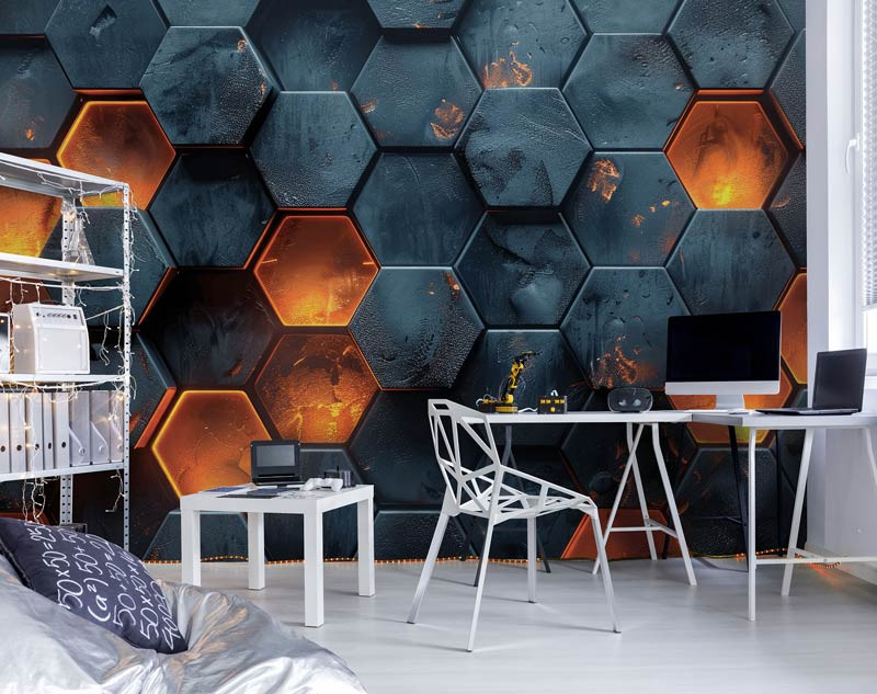 Bringen Sie mit unserer Fototapete Hexagon Lava eine explosive Energie in Ihr Interieur. Diese einzigartige Fototapete zeigt ein 3D-Muster aus Sechsecken, von denen einige von Lava umhüllt sind, wodurch ein beeindruckender und futuristischer Effekt entsteht. Perfekt für das Spielzimmer, das Kinderzimmer oder jeden anderen Raum, verleiht dieses Design jedem Raum ein aufregendes und kraftvolles Element, das die Fantasie anregt und die Atmosphäre von Abenteuer und Action verstärkt.