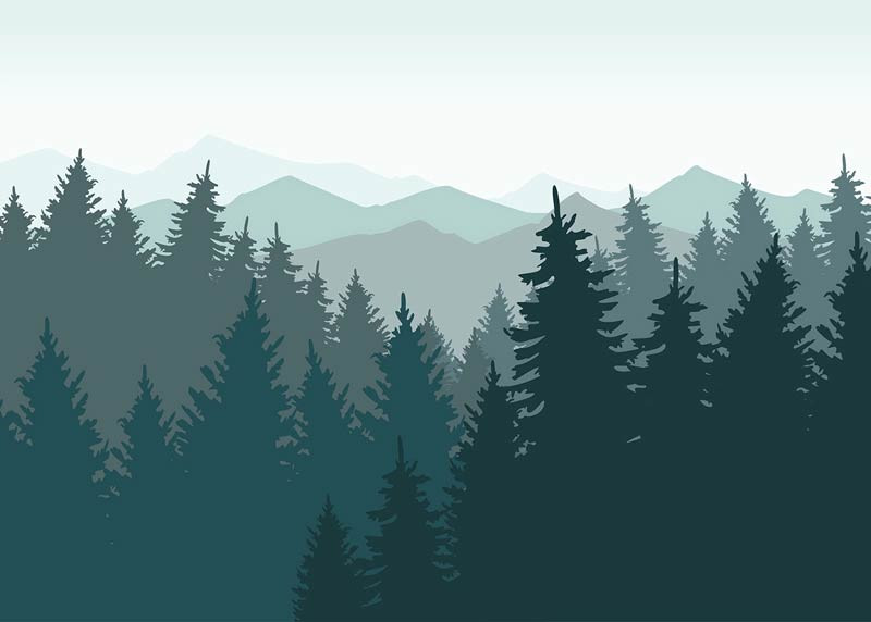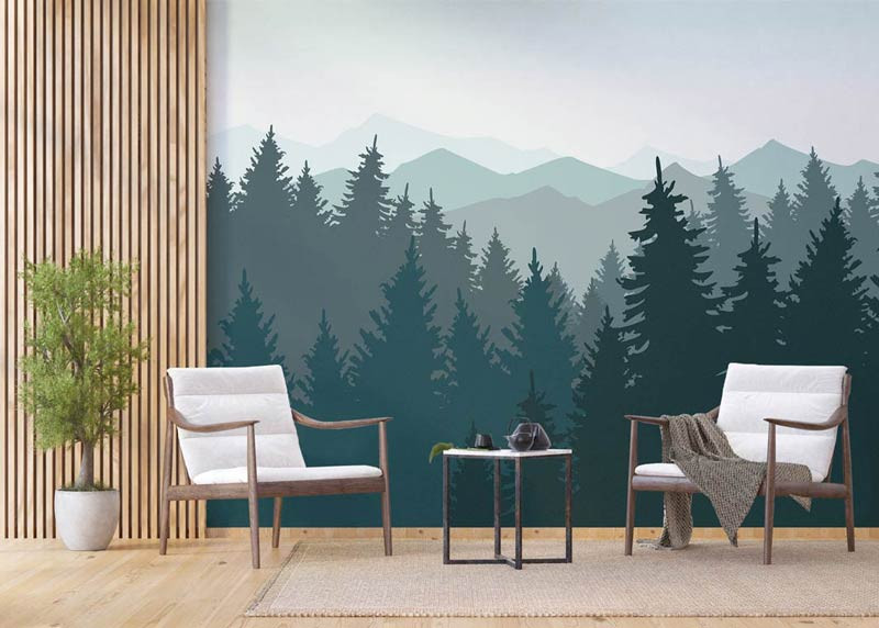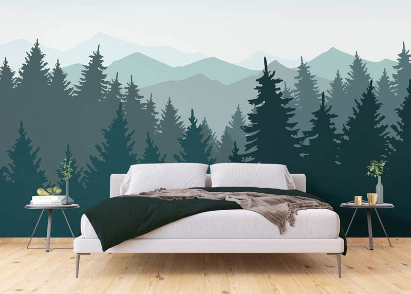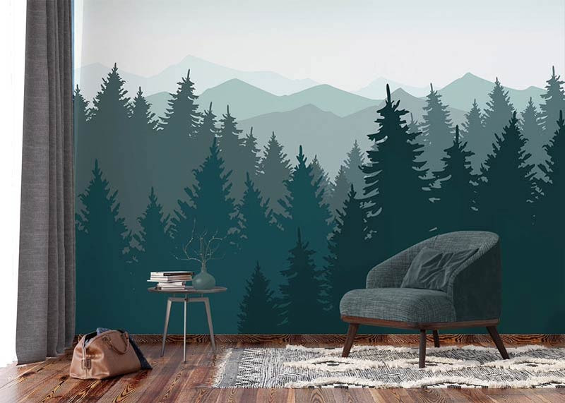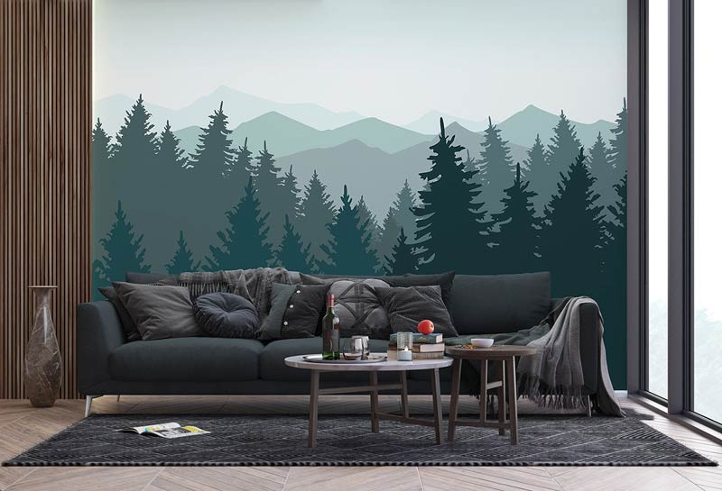 Diese Silhouette von Kiefern und Bergen sorgt für ein subtiles Naturgefühl. Die sanften Töne und der minimalistische Stil bringen Ruhe in jeden Raum. Diese Fototapete ist leicht anpassbar.