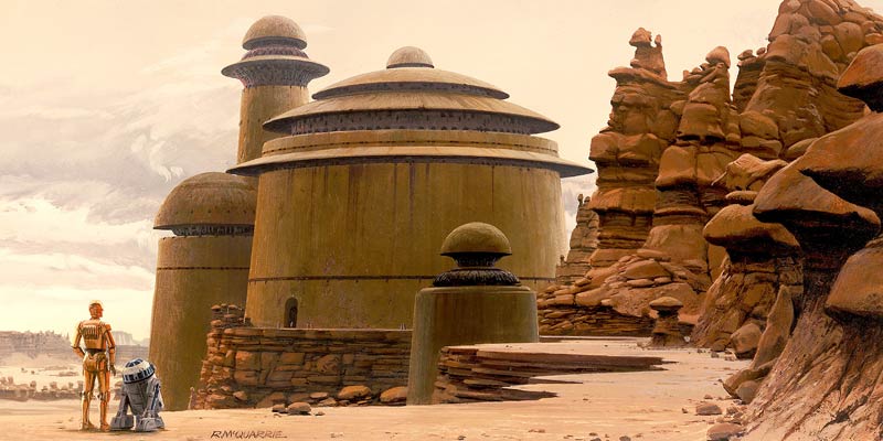 R2 D2 und C-3PO auf der Suche nach Han Solo vor dem Jabbas-Palast auf Tatooine.