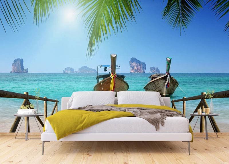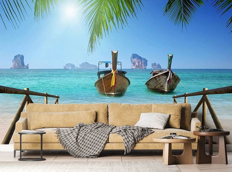 Holen Sie sich das Urlaubsgefühl nach Hause mit dieser tropischen Meereslandschaft mit azurblauem Wasser, Booten und üppigen Palmenblättern. Die leuchtenden Farben und die hohe Auflösung bringen jedes Detail perfekt zur Geltung.