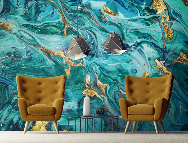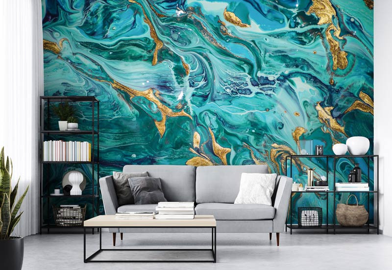 Marmortapete in Türkis und Gold. Marmortapeten sind heutzutage sehr beliebt, da sie von echtem Marmor kaum zu unterscheiden sind.