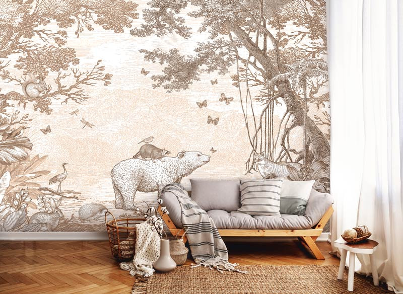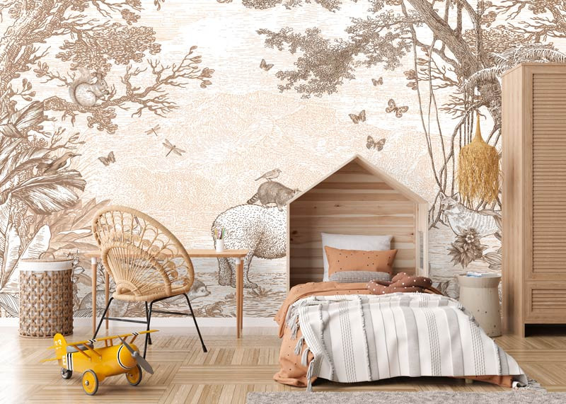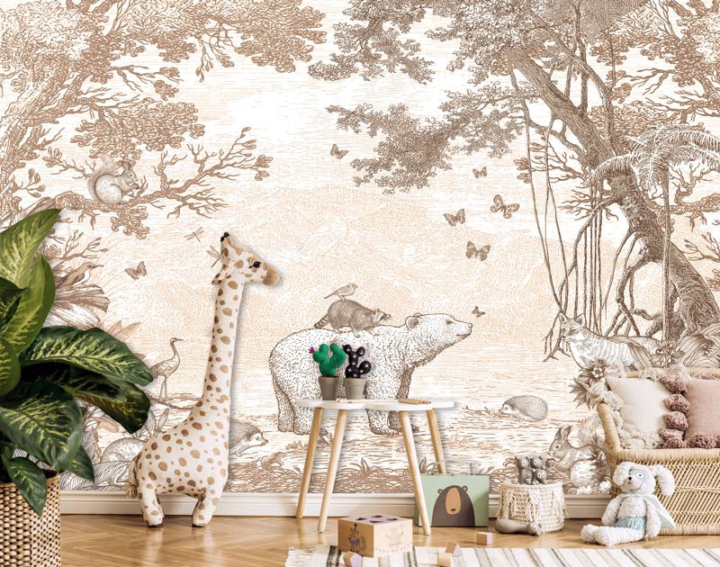 Mit ihren warmen Farben und ihrem zeitlosen Charme ist diese Fototapete eine ideale Wahl für das Kinderzimmer oder das Babyzimmer. Verleihen Sie dem Raum einen einzigartigen und natürlichen Look mit dieser schönen Waldtier-Tapete in Terrakotta-Farben.