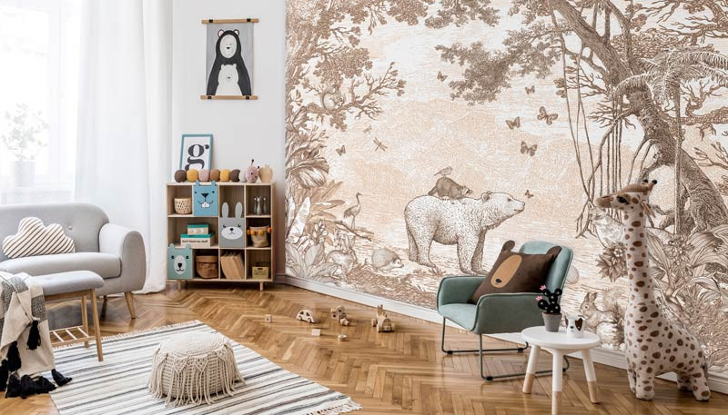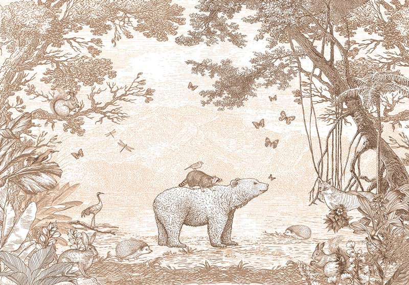 Bringen Sie eine warme und stimmungsvolle Atmosphäre in Ihr Kinderzimmer mit der Tapete Waldtiere - Terracotta. Diese schöne Fototapete zeigt eine gemütliche Szene mit einem Bären und anderen Waldtieren in einer waldigen Umgebung. Die Terrakotta-Töne schaffen einen beruhigenden und stilvollen Look, perfekt für eine gemütliche und natürliche Atmosphäre im Raum.