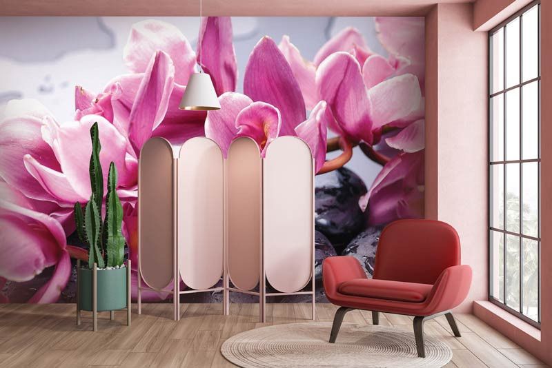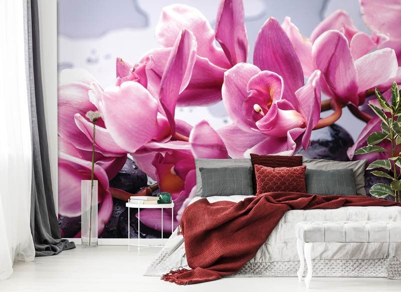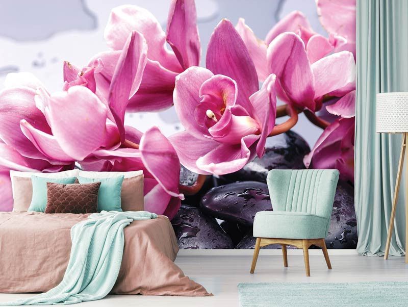 Fototapete mit Blumen und Steinen für Wellness, Sauna oder Spa, aber natürlich passt die Fototapete auch perfekt in andere Räume.