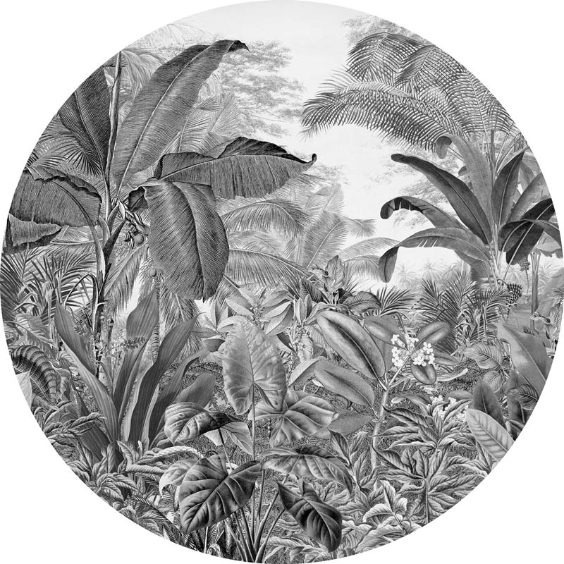 Die eigentlich so farbenfrohe Flora des tropischen Dschungels ist auf diesem Tapetenkreis in schlichtes Schwarz und Weiß getaucht. Gerade durch diese Farbreduktion kommen die Details der exotischen Pflanzen besonders gut zur Geltung.