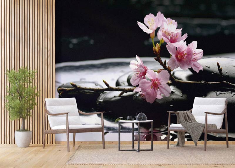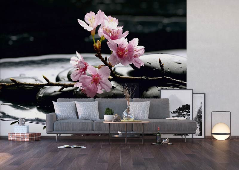 Genießen Sie die Ruhe und Ausgeglichenheit von Zen-Steinen in Kombination mit der zarten Schönheit von Kirschblüten. Diese Fototapete strahlt durch die sanften Rosatöne der Blüten im Kontrast zu den erdigen Farben der Steine Gelassenheit und Harmonie aus.